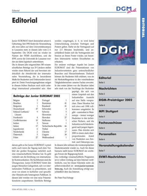 Junior EUROMAT feiert demnächst seinen 6. Geburtstag. Seit 1992 findet die Veranstaltung alle zwei Jahre auf dem Universitätscampus in Lausanne statt, in diesem Jahr vom 2. bis 5. September. Die DGM wird sie wieder im Namen der FEMS durchführen, und die EPFL sowie die Université de Lausanne werden sie dabei logistisch unterstützen.