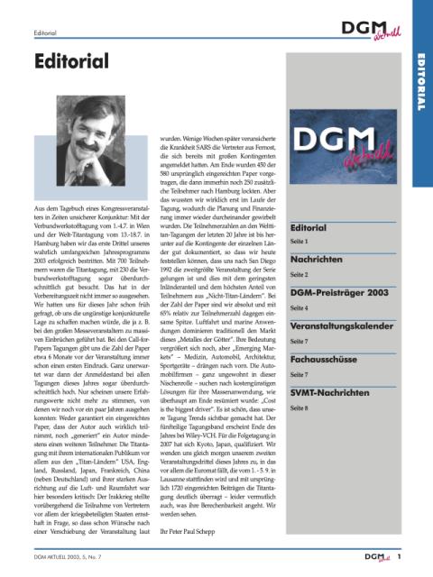 Mit der Verbundwerkstofftagung vom 1.–4.7. in Wien und der Welt-Titantagung vom 13.–18.7. in Hamburg haben wir das erste Drittel unseres wahrlich umfangreichen Jahresprogramms 2003 erfolgreich bestritten. Mit 700 Teilnehmern waren die Titantagung, mit 230 die Verbundwerkstofftagung sogar überdurchschnittlich gut besucht. Das hat in der Vorbereitungszeit nicht immer so ausgesehen.