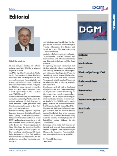 So haben wir Anfang August die Mitgliederbetreuung in unserer Geschäftsstelle durch Herrn Dipl.-Ing. Claus Hasenkamp verstärkt. Er hat sein Werkstofftechnik-Studium an der RWTH Aachen abgeschlossen, bevor er, wie viele von Ihnen wissen, in den vergangenen sechs Jahren die „Interessengemeinschaft Neue Materialien in Nordrhein-Westfalen (NeMa)“ erfolgreich auf- und ausgebaut hat. Herr Hasenkamp arbeitet nun zu 50 % für die DGM. Zusammen mit Frau Tölle und Frau Klimm widmet er sich ausschließlich der Mitgliederbetreuung und der Gewinnung neuer Mitglieder.