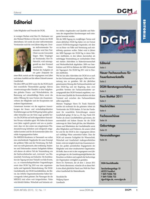 Mit der MSE-Tagung im zweijährigen Turnus und einem jährlichen DGM-Tag haben wir ein Format unserer DGM-Kerntagungen begründet, mit dem wir im Sinne von Nähe und Vernetzung auch mittelfristig operieren wollen. Dabei wird in Jahren der MSE-Tagungen der DGM-Tag in deren Rahmen stattfinden, in den Jahren dazwischen als mehrtägige Veranstaltung an wechselnden Orten mit starken Aktivitäten in Materialwissenschaft und Werkstofftechnik abgehalten. 2009 war Saarbrücken und 2010 im Rahmen der MSE Darmstadt der Tagungsort. Der DGM-Tag 2011 wird in Dresden stattfinden.