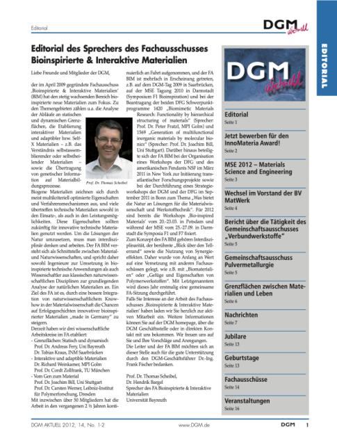 Für 2012 sind bereits die Workshops „Bio-inspired Materials“ vom 20.-23.03. in Potsdam und während der MSE vom 25.-27.09. in Darmstadt die Symposia F1 und F7 fixiert.