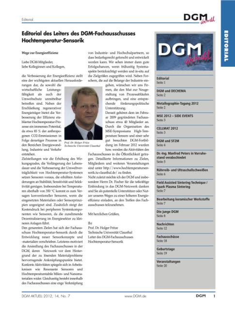 Derzeit gehören dem im Februar 2009 gegründeten Fachaus-schuss etwa 40 Mitglieder an. Durch die Organisation des MSE-Symposiums „High-Temperature Sensors“ und einer sehr gut besuchten DGM-Fortbildung im Februar 2012 wurden bzw. werden die Aktivitäten des Fachausschusses in die Öffentlichkeit getragen. Detaillierte Informationen zu Zielen, Mitgliedern und weiteren Veranstaltungen sind unter http://www.hochtemperatursensorik.tu-clausthal.de/ zu finden.