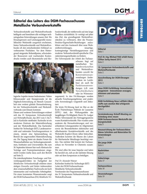 Die interdisziplinären Forschungsaktivitäten im Bereich der Metallischen Verbundwerkstoffe wachsen stetig und bieten insbesondere dem wissenschaftlichen Nachwuchs ein dynamisches und vielversprechendes Arbeitsfeld. Der DGM-Fachausschuss (FA) Metallische Verbundwerkstoffe verfolgt seit Jahren das Ziel, das grundlegende Werkstoffverständnis zu verbessern und die Wechselwirkungen zwischen Prozess, Struktur und Eigenschaften zu klären. Ein weiterer Schwerpunkt liegt auf der Förderung des Austauschs über neue Werkstoffentwicklungen, kostengünstige Herstellungsprozesse und moderne Charakterisierungsmethoden.