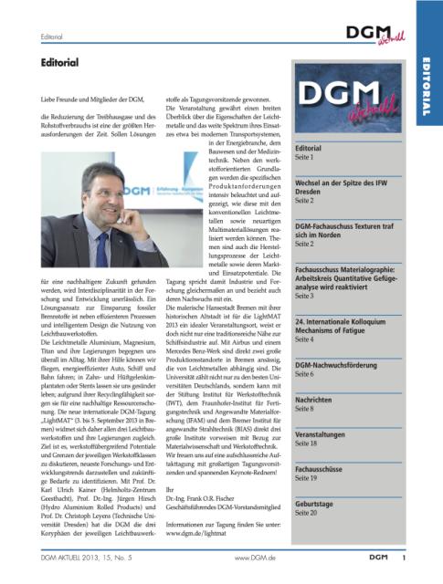 Die Leichtmetalle Aluminium, Magnesium, Titan und ihre Legierungen begegnen uns überall im Alltag. Mit ihrer Hilfe können wir fliegen, energieeffizienter Auto, Schiff und Bahn fahren; in Zahn- und Hüftgelenkimplantaten oder Stents lassen sie uns gesünder leben; aufgrund ihrer Recyclingfähigkeit sorgen sie für eine nachhaltige Ressourcenschonung. Die neue internationale DGM-Tagung „LightMAT“ (3. bis 5. September 2013 in Bremen) widmet sich daher allen drei Leichtbauwerkstoffen und ihre Legierungen zugleich. Ziel ist es, werkstoffübergreifend Potentiale und Grenzen der jeweiligen Werkstoffklassen zu diskutieren, neueste Forschungs- und Entwicklungstrends darzustellen und zukünftige Bedarfe zu identifizieren. Mit Prof. Dr. Karl Ulrich Kainer (Helmholtz-Zentrum Geesthacht), Prof. Dr.-Ing. Jürgen Hirsch (Hydro Aluminium Rolled Products) und Prof. Dr. Christoph Leyens (Technische Universität Dresden) hat die DGM die drei Koryphäen der jeweiligen Leichtbauwerkstoffe als Tagungsvorsitzende gewonnen.