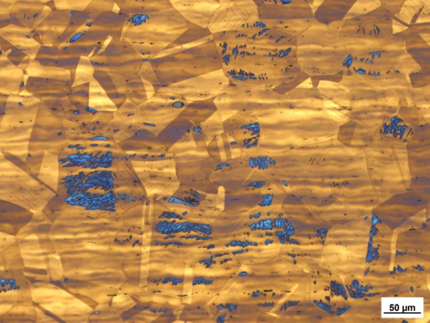Es kann auch eine Stammlösung aus 500 ml Wasser und 100 g Ammoniumhydrogendiflourid angesetzt werden, dann muss zum Ätzen einer kleineren Menge jeweils nur noch das Kaliumdisulfit zugesetzt werden. Aufbewahrung und Ätzen immer in Kunststoffgefäßen! Die enthaltene Flouridverbindung greift Glas an! Beim Ätzen kann ein leichter Geruch nach faulen Eiern wahrgenommen werden (H2S-Bildung). Erwärmen des Ätzmittels (Kunststoffschälchen im Wasserbad) auf ca. 30-35°C beschleunigt und verbessert die Ätzung. Wenn die Schlifffläche anfängt sich braun zu färben, zählt jede weitere Sekunde: sobald sich eine bläuliche Färbung zeigt, Schliff sofort raus und ins Wasserbad tauchen, gut wässern, danach mit Ethanol abspülen und trocknen wie gewohnt. Nicht zu heiß föhnen, dabei kann die dünne Ätzhaut aufplatzen, was zwar interessante, aber ungewünschte Artefakte erzeugt. Kornflächenätzung: Austenit wird braun blau violett gefärbt. Deltaferrit bleibt weiß hell. Rein ferritische Chromstähle können manchmal auch mit Lichtenegger-Bloech gefärbt werden, besser eignet sich dafür aber Beraha II.