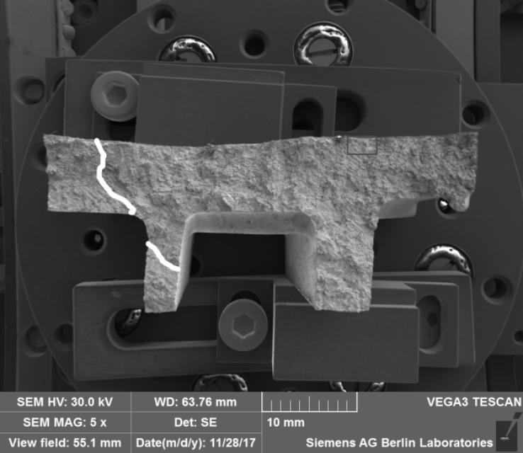 An einem in einer Großgasturbine zur Stromerzeugung verwendeten Zwillings-Turbinenleitschaufelsegment der dritten Stufe wurde eine die Schaufelblattwand durchdringende Querrissbildung festgestellt. Im Rahmen einer Laboruntersuchung wurde als metallurgische Ursache für das Versagen Wiederaufschmelzungsrissbildung (Liquation Cracking, LC), ein Heißrissmechanismus, ermittelt. Wie sich erst nach der Untersuchung herausstellte, war die Grundursache des Versagens die Fehlfunktion einer für das thermische Aufspritzen der keramischen Wärmedämmdeckschicht auf die entsprechende Komponente verwendete Plasmaspritzdüse.