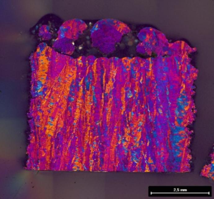 Hellfeldbeleuchtung: Fokus liegt auf der Darstellung der Schweißlinsen/ Schmelzbäder. Polarisiertes Licht: Fokus liegt auf der Darstellung der epitaktisch gewachsenen Überstuktur.