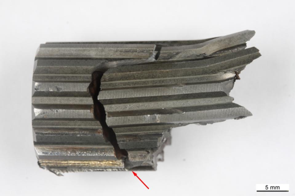 Uns wurde vom Ausfall mehrerer Hochdruck-Anhebeölpumpen an ihrem Einsatzort berichtet. Diese Baugruppen dienen dazu, Schmieröl in die Gleitlager schwerer rotierender Turbomaschinen, beispielsweise Dampf- und Gasturbinenrotoren, einzuspritzen. Deren Gewicht liegt häufig bei über hundert Tonnen. So wird sichergestellt, dass die Rotorwelle auch bei geringen Drehzahlen auf dem Schmierölfilm „schwimmt“, wenn die Voraussetzungen für eine hydrodynamische Schmierung noch nicht vollständig gegeben sind. Zwecks Ermittlung der metallurgischen Grundursache des Versagens stellte der Kunde eine gebrochene Keilwelle zur Verfügung. Es handelte sich in diesem Fall um die Abtriebswelle einer der ausgefallenen Pumpen. Die Keilwelle versagte durch Torsionsüberlast, durch die es zur Rissbildung in der gehärteten Randschicht (Einsatzschicht) und als Sekundärschaden zur Rissbildung durch hochzyklische Ermüdung (High Cycle Fatigue, HCF) kam. Die Hauptermüdungsrisse in der Einsatzschicht bildeten sich an Gewaltbrüchen in den Übergangsradien am Fuß der Keilwellenzähne. Es konnten keine Hinweise auf Materialfehler gefunden werden, die zum Schaden hätten beitragen oder den Schaden verursacht haben könnten.