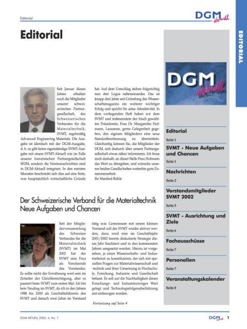 Seit Januar dieses Jahres erhalten auch die Mitglieder unserer schweizerischen Partnergesellschaft, des Schweizerischen Verbandes für die Materialtechnik, SVMT, regelmäßig Advanced Engineering Materials.