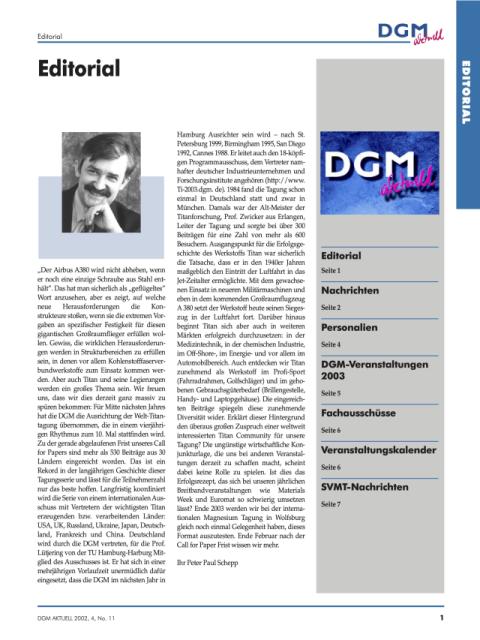 Ist dies das Erfolgsrezept, das sich bei unseren jährlichen Breitbandveranstaltungen wie der Materials Week und der Euromat so schwierig umsetzen lässt? Ende 2003 werden wir bei der internationalen Magnesium-Tagung in Wolfsburg gleich noch einmal Gelegenheit haben, dieses Format zu testen. Ende Februar, nach Ablauf der Call-for-Papers-Frist, wissen wir mehr.