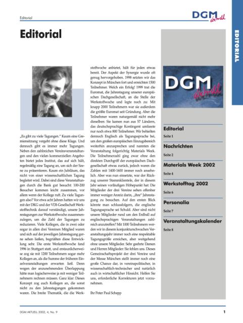 Vor etwa acht Jahren hatten wir uns mit der DKG und der VDI-Gesellschaft Werkstofftechnik darauf verständigt, unsere Jahrestagungen zur Werkstoffwoche zusammenzulegen, um die Zahl der Tagungen zu reduzieren. Viele Kollegen, die in zwei oder sogar in allen drei Vereinen Mitglied waren und sich auf der jeweiligen Jahrestagung gerne sehen ließen, begrüßten diese Entwicklung sehr.