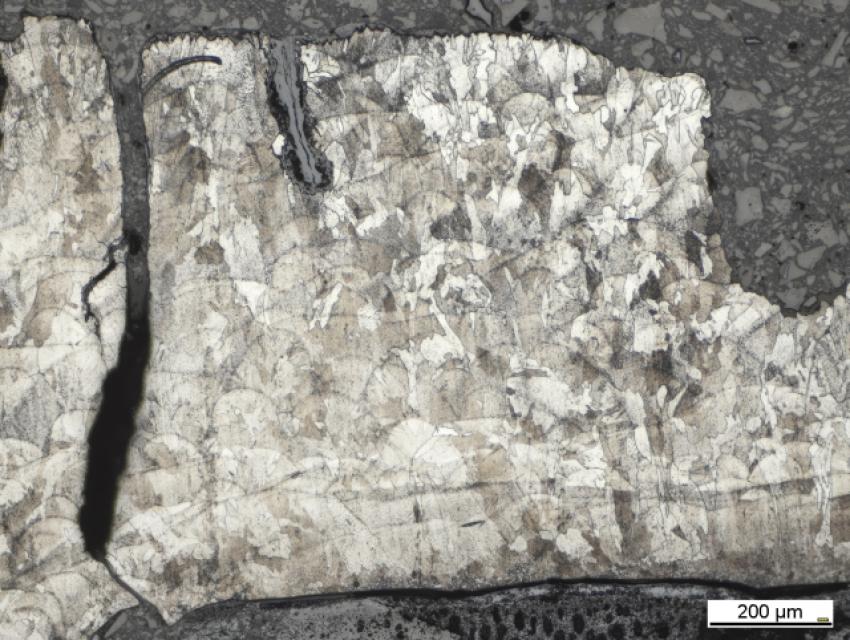 Ein neuartiger, für eine Fertigung durch Selektives Laserschmelzen (Selective Laser Melting, SLM) konzipierter und mittels SLM gefertigter Kopf eines Kohlevergasungsbrenners wurde vom Kunden eingeführt. Durch eine Rissbildung am gekühlten Kopf kam es zum vorzeitigen Ausfall des Bauteils. Die metallurgische Fehlerursache war Überhitzung durch Verstopfung von Kühlkanälen, die wahrscheinlich auf verunreinigtes Kühlwasser zurückzuführen ist, das in einem dem Brenner vorgeschalteten Bereich zu Korrosion im nicht rostfreien Rohrleistungssystem führte. Korrosionsprodukte, im Wesentlichen Eisenoxide, platzten von den nicht rostfreien Komponenten ab und führten in den komplexen Kühlhohlräumen des durch Additive Fertigung (Additive Manufacturing, AM) hergestellten Brennerkopfes zu Verstopfungen. Hierdurch kam es zu übermäßiger thermischer Überlastung, im Laufe derer die Schmelztemperatur der Legierung am Brennerkopf erreicht wurde. In der Folge kam es zum Versagen des entsprechenden Brennerkopfes aufgrund von Rissbildung durch thermomechanische Ermüdung (Thermo-Mechanical Fatigue, TMF). Im Zuge dieser Schadensuntersuchung konnten weder Herstellungs- noch Konstruktionsfehler gefunden werden. Es wird gemutmaßt, dass das entsprechende Bauteil bei ordnungsgemäßer Kühlung normal arbeitet. Die Grundursache für das Versagen liegt im Betrieb des Kühlwassersystems des entsprechenden Brenners, bei dem sich lose Korrosionsprodukte bilden und in den Brennerkopf gelangen konnten.