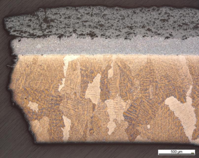 Eine Turbinenleitschaufel der ersten Stufe einer Großgasturbine mit einer nach außen gerichteten, um etwa 0,6 mm herausragenden Auswölbung und einem in der Beschichtung sichtbaren Riss wurde vom Kunden zwecks ausführlicher, nicht zerstörungsfreier Schadensuntersuchung bereitgestellt. Es handelte sich um ein Versuchsbauteil aus einer Prüffeldmaschine. Die saugseitige Wand des Gussteils wurde herausgeschnitten, wobei ein klaffender Riss auf der Innenseite des hinteren Hohlraums freigelegt wurde, der auch bei einer boroskopischen Untersuchung zu erkennen war. Der Kühleinsatz des hinteren Hohlraums war sauber und wies keine verstopften Kühlbohrungen auf. Das Kühlmuster auf der Innenwand des hinteren Hohlraums war unauffällig. Im gerissenen Bereich auf der saugseitigen Oberfläche der entsprechenden Schaufel konnten keinerlei Anhaltspunkte für einen Fremdkörpereinschlag gefunden werden. In der noch immer aufrechterhaltenen Hypothese zur wahrscheinlichsten Grundursache der Rissbildung wird von einer Kombination einer geringen Wanddicke, nicht optimalen Prozessparametern für die Vorwärmung vor der Aufbringung der Haftvermittlerschicht und möglicherweise starken thermisch-mechanischen Belastungen beim Turbinenbetrieb ausgegangen. Allem Anschein nach handelt es sich nicht um ein verbreitetes Phänomen, sondern eher um einen Einzelfall.