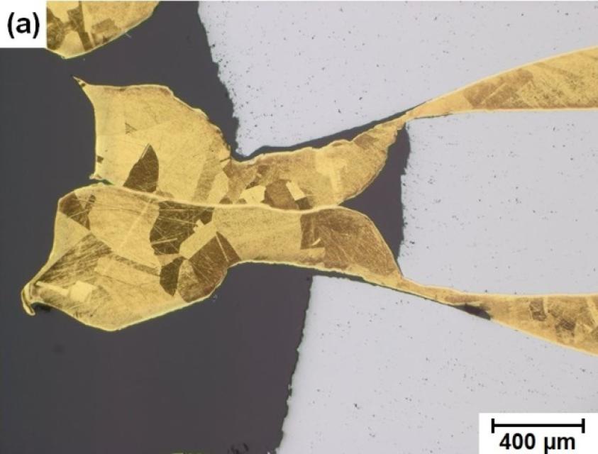 Die Ätzung des Goldes war herausfordernd, da viele Ätzmittel, die Gold ätzen könnten, bevorzugt den Stahl angreifen. In Anlehnung an die Gewinnung von Gold mittels Cyanidlaugung, wurde eine KCN-Lösung als Ätzmittel verwendet. Es konnte gezeigt werden, dass bereits der Luftsauerstoff als Oxidationsmittel ausreicht, um Gold zu ätzen. Mit einer Mischung aus KCN-H2O2 ist die Ätzwirkung jedoch effektiver. Die Goldkorngrößen in den Goldlagen können bis zu 1 mm erreichen. An den Grenzflächen zwischen Stahl und Gold ist eine ca. 10 μm dicke Diffusionszone zu erkennen.