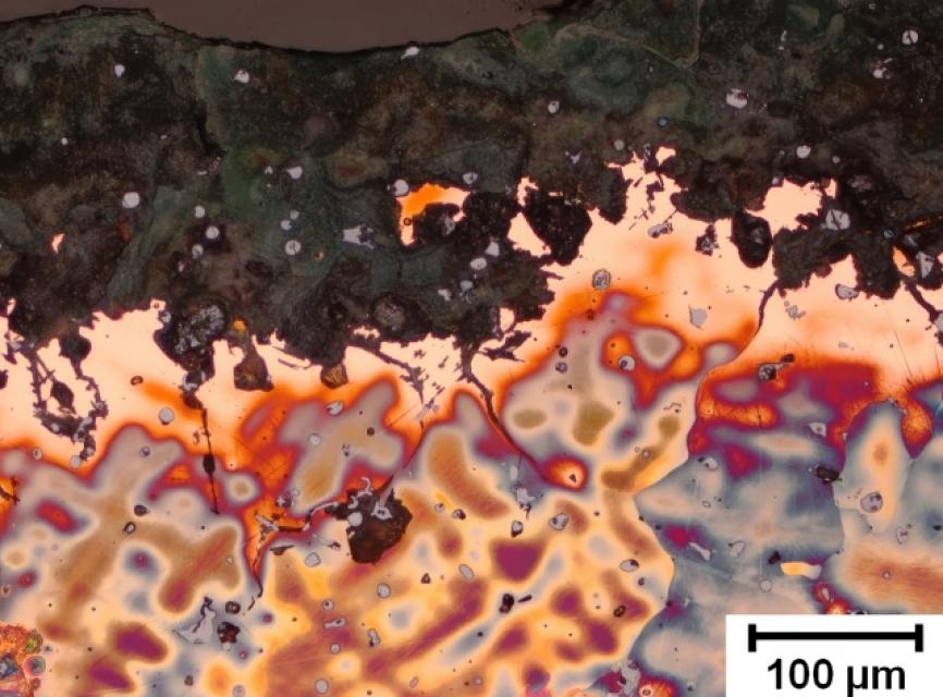An der Oberfläche der Sichel liegt eine bis zu 500 μm dicke Patina vor, welche schichtförmig aufgebaut ist. In den äußeren Schichten werden etwas höhere Sn Gehalte gemessen als in der inneren Schichten.